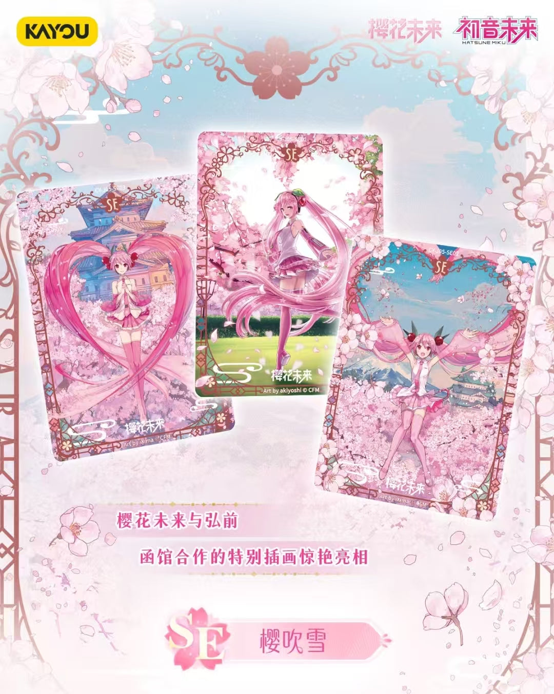 - SE Sakura Fubuki Cards feature exclusive illustrations of Sakura Miku in collaboration with Hirosaki and Hakodate.